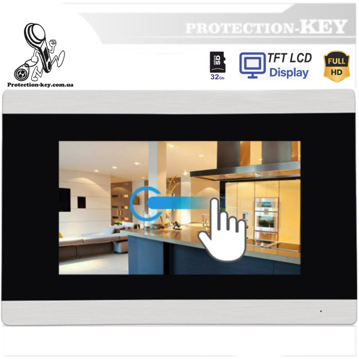 Кольоровий відео домофон Touch Screen із пам'яттю 7 дюймів монітор , можливість підключення до 2-х викликових панелі, підключення 2-х додаткових камер, можливість підключення до 4-х моніторів, пам'яті фото-відео, підтримка SD-карти до 32GB, календар , дуплексний зв'язок, регулювання гучності, яскравості, контрастності. візуальний контроль ситуації перед телекамерою, сенсорні кнопки,